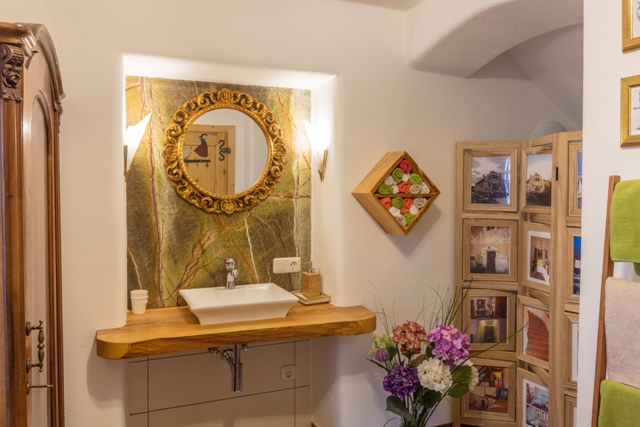 Die Wohnung "Romantik" im Erdgeschoß hat einen Vorraum, eine gemütliche Stube mit Essecke, Chaiselonge, Der Holzherd (auch zum Kochen und Backen geeignet) erinnert an eine gemütliche Almhütte. Selbstverständlich steht aber auch ein Induktionsfeld zum Kochen zur Verfügung. Kühlschrank mit Gefrierfach, Kaffeemaschine (Nespresso), Wasserkocher, genügend Geschirr, Gläser und Töpfe ergänzen die Küchenausstattung. Weiters gibt es in dieser Wohnung ein sehr großes Badezimmer mit Duschgrotte und WC, ein Schlafzimmer mit einem Doppelbett (Länge: 200 cm ohne Fußteil) Kabel TV und freies WLAN.